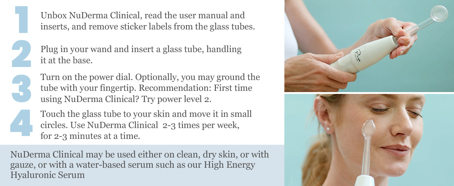 - Specialized Applicators for Total Body Sessions- NuDerma Clinical features specialized glass applicators like a Y-shaped wand that can conveniently be applied to areas like your arms and neck or a Rod applicator that works with broader areas like belly and back. A supercharged comb wand is perfect to energize the scalp and hair.